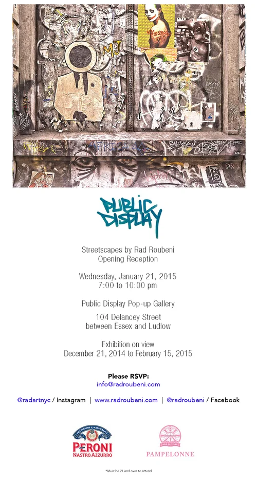 Public Display NYC" Solo Exhibition NYC 2015 Wednesday, January 21, 2015 7:00 PM 10:00 PM 19:00 22:00 POP UP Gallery 104 Delancey Street New York, NY, 10002 United States (map) Google Calendar ICS